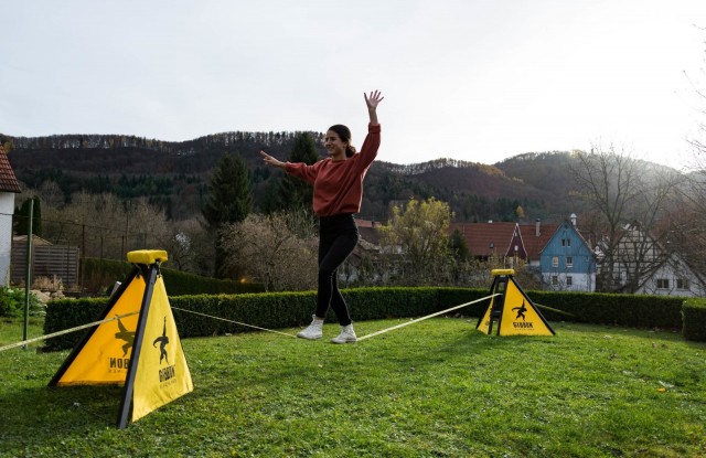 voor extra evenwicht. Mocht je slackline buddy in de buurt zijn,