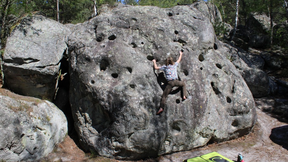 Op de foto zie je onze collega Kaylee boulderen in Fontainebleau.