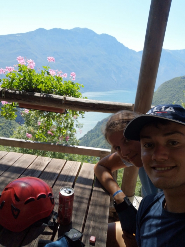 Spannend was het zeker, de Via Ferrata tocht bij het Gardameer! Als beginner vraag je jezelf toch af ´´Heb ik wel voldoende conditie en is het niet te zwaar?’’. Zo dachten Raymon en ik als tweede optie met een lift omhoog te gaan naar de Monte Baldo, waar je ook een prachtig uitzicht hebt over het Gardameer. Dit idee werd overtroffen door deze Via Ferrata tocht. Na deze tocht besef je echt hoe mooi een uitzicht kan zijn als je moeite hebt gedaan om er te komen. Het eerste deel van de tocht bestond uit een wandeling en dit werd al snel een beklimming. Aan het begin vond ik de smalle paden met losliggende stenen best spannend om op te lopen. Je merkt dat het belangrijk is om een schoen aan te hebben met voldoende grip. Na een uur begonnen mijn kuiten al een beetje te verzuren, maar het uitzicht en de oude oorlogsmonumenten die je tegenkomt onderweg geven motivatie om door te lopen.