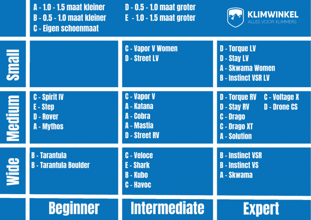 Dit schema geeft een indicatie per schoen van de juiste maat ten opzichte van je eigen schoenmaat bij een neutrale fit. Hoe je de klimschoenen het liefst draagt is natuurlijk persoonlijk.