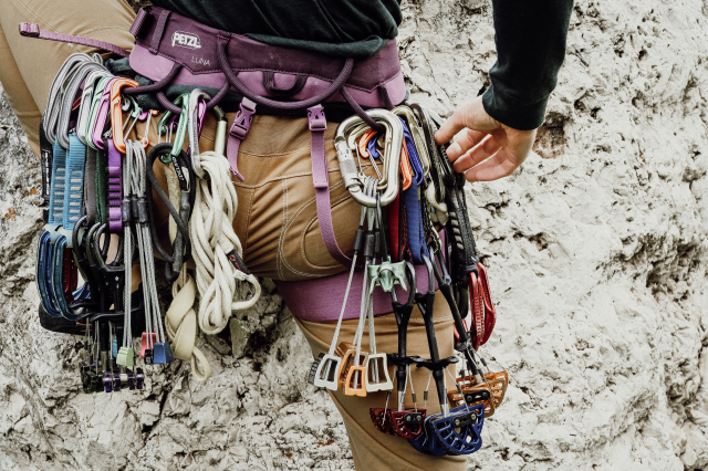 Gelukkig hebben we een aantal nuts en cams meegenomen, die zachtjes tegen mijn bovenbenen tikken bij elke beweging die ik maak. In eerste instantie vroeg ik me af of die grotere materiaallussen nou echt zoveel uitmaakten bij het tradklimmen en multipitchen, maar nu moet ik toch echt toegeven: size does matter. De voorste materiaallussen zijn beduidend groter dan bij andere gordels en bieden ruim plaats aan alle cams en setjes die ik binnen handbereik wil hebben. In plaats van achter mijn rug te moeten graaien zie ik nu direct waar de cam hangt die ik nodig heb, wat het plaatsen van materiaal een stuk vlotter en vloeiender maakt. De achterste materiaallussen zijn daarnaast zo geplaatst dat setjes en karabiners vanzelf naar voren glijden waardoor ook deze verrassend goed bereikbaar zijn. Voor deze multipitch bieden de vier gearloops meer dan voldoende ruimte, maar voor extra materiaal is er zelfs nog een stevige vijfde lus gemaakt aan de achterkant van de gordel.