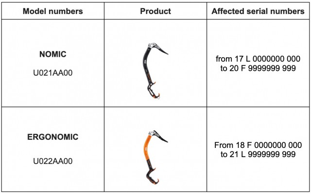 Petzl roept bepaalde batches terug van de ijsbijlen NOMIC (U021AA00) en ERGONOMIC (U022AA00). Er is een risico op handgreepbreuk, waardoor de klimmer kan vallen. Stop direct met het gebruik van een betrokken ijsbijl en neem contact op met Petzl after-sales voor een vervangende schacht.