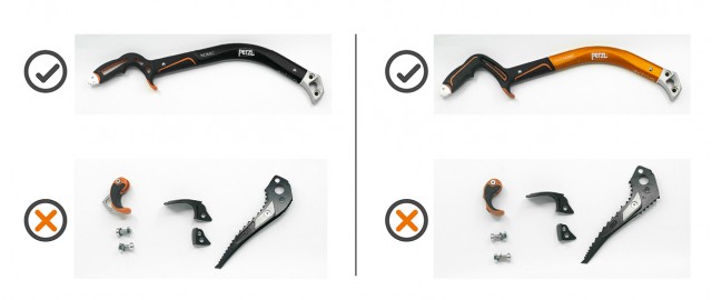 - Verwijder de pick en accessoires (gewichten, adze, hamer) en ook de GRIPREST handsteun van de ijsbijl (Petzl verwijst naar een tutorial in de FAQ).