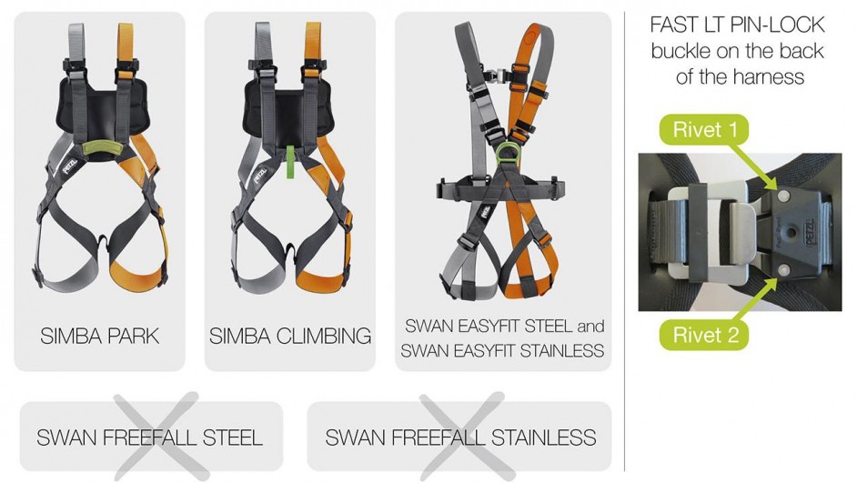 Safety warning Petzl Simba en Swan Easyfit (Fast LT Pin-Lockgesp)