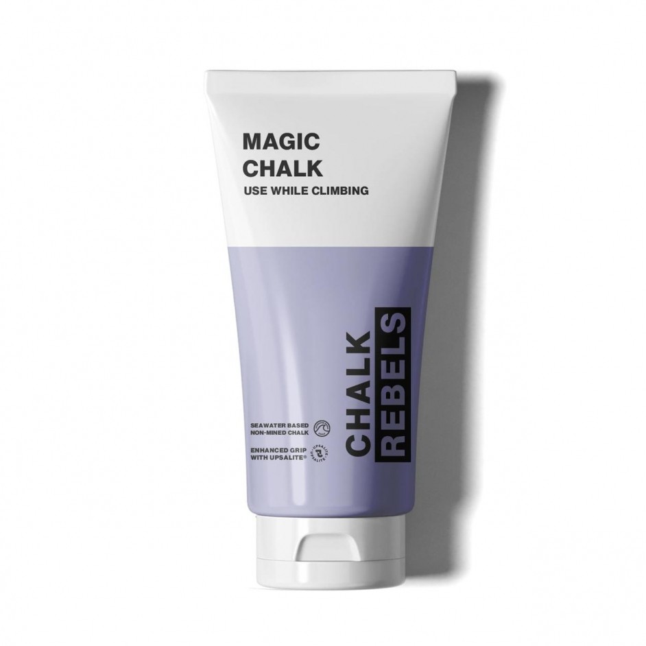 De Magic Chalk van Chalk Rebels. Het effect van vloeibare magnesium werkt tot twee keer langer dan de gewone pof, daarnaast gebruikt deze magnesium Upsalite® technologie. Daarnaast stoft vloeibare magnesium een stuk minder dan de poeder varianten en het verminderd verkleuring van klimgrepen en rotsen. Voor een extra effect is het ook mogelijk om de vloeibare magensium te gebruiken als onderlaag voor je gewone magnesium. De meeste pof komt uit magnesium mijnen in China. Echter wordt de magnesium van Chalk Rebels uit zeewater gehaald, wat beter is voor het milieu. Hierdoor weet je zeker dat je met Chalk Rebels de schoonste magnesium gebruikt met de beste ingrediënten. Beter voor je handen, en voor de planeet!