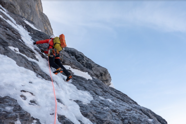 Danny Schoch in de Eiger Noordwand op Scarpa Phantom Tech.
