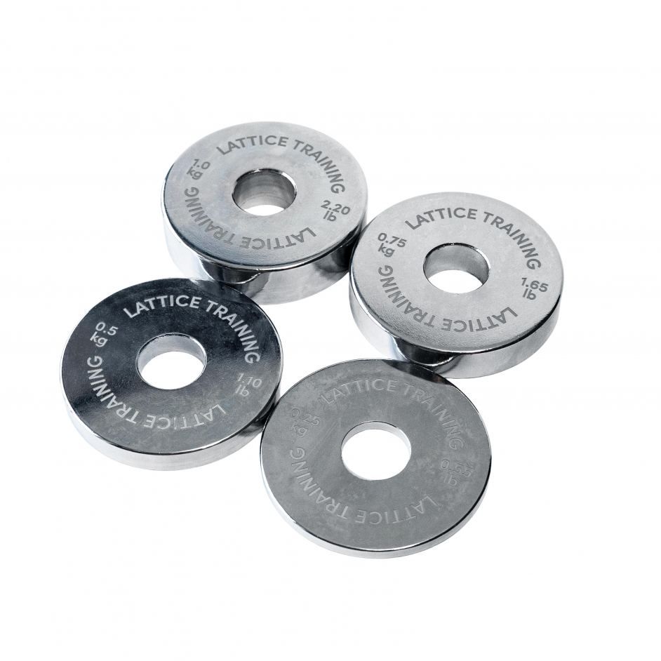 De Lattice training Fractional Weights bestaat uit vier verschillende schijven in verschillende gewichten. De Fractional weights kunnen met verschillende lifting pins en barbells gebruikt worden.