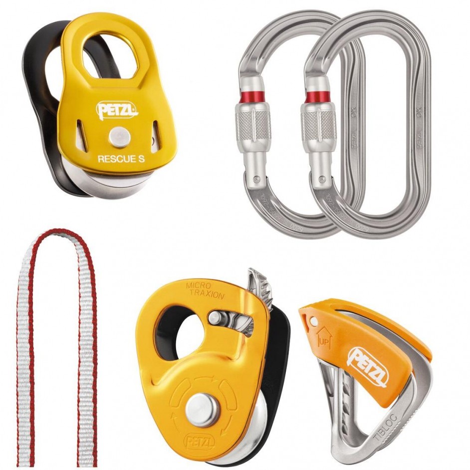 - Inhoud: 1 Micro Taxion pulley, 2 OK Screw-lock karabiners, 1 Tibloc, 1 Rescue S pulley, 1 St’Anneau (120 cm)