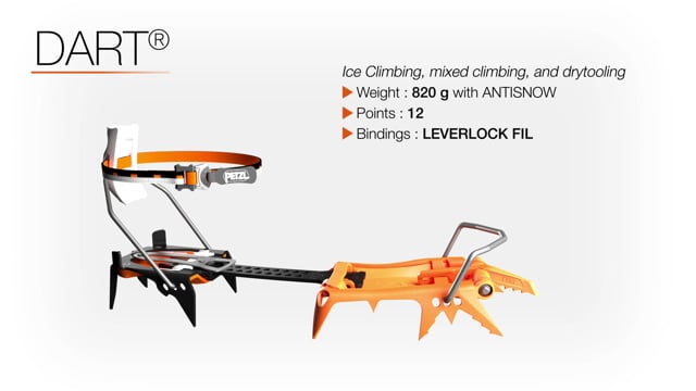 De Petzl Dart is een technische en verstelbare stijgijzer voor ijsklimmen en drytoolen. De lengte van de voortanden kan worden versteld. Daarnaast kunnen de voortanden van de Dart aangepast worden naar een mono of dual point. De korte mono point is geschikt voor ijsklimmen, de lange mono point voor mixed climbing en de dual point is het meest geschikt voor gletsjers en alpinisme. Het stalen frame van de Darts is duurzaam en slijtvast. De stijgijzer komt alleen in een een Leverlock fil versie. Hierdoor is de Dart alleen geschikt voor schoenen met een voor- en achterkant bevestiging.